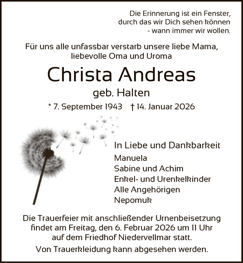 Hier finden Sie alle Traueranzeigen aus der Zeitung, die bisher für Christa Andreas erschienen sind. Weitere Traueranzeigen, die in der Zeitung erscheinen, werden hier ebenfalls aufgelistet