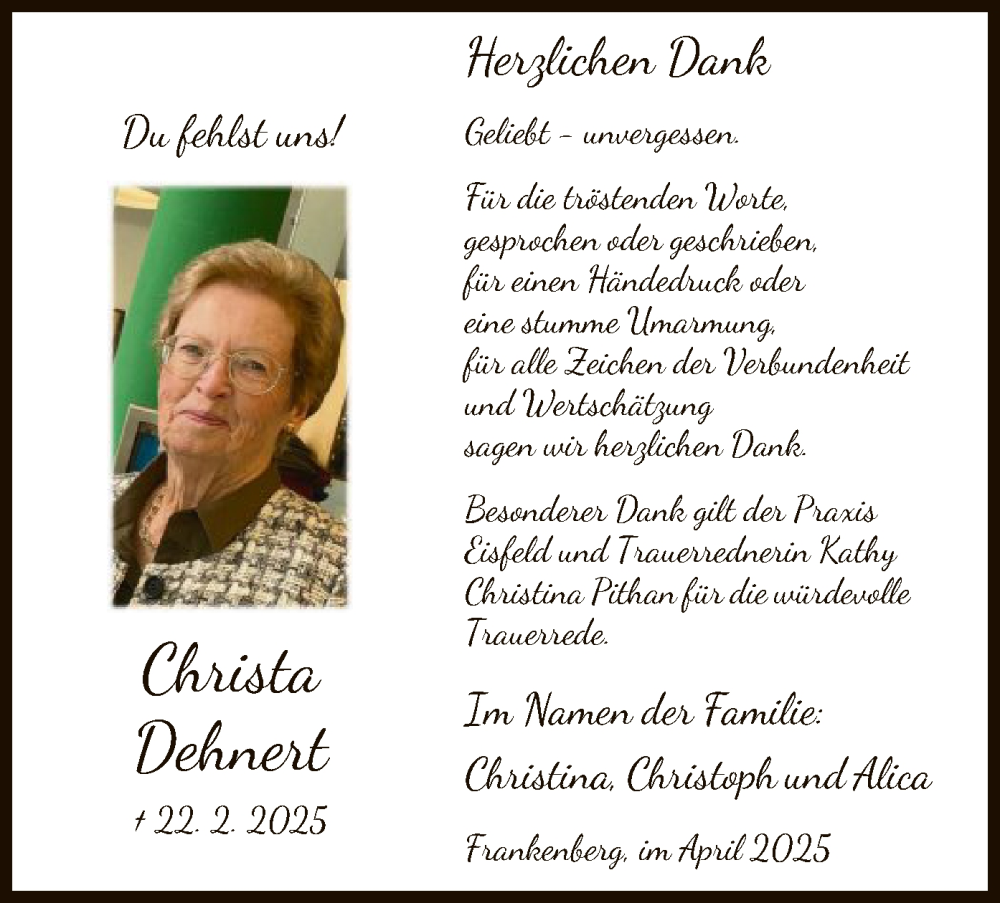 Hier finden Sie alle Traueranzeigen aus der Zeitung, die bisher für Christa Dehnert erschienen sind. Weitere Traueranzeigen, die in der Zeitung erscheinen, werden hier ebenfalls aufgelistet