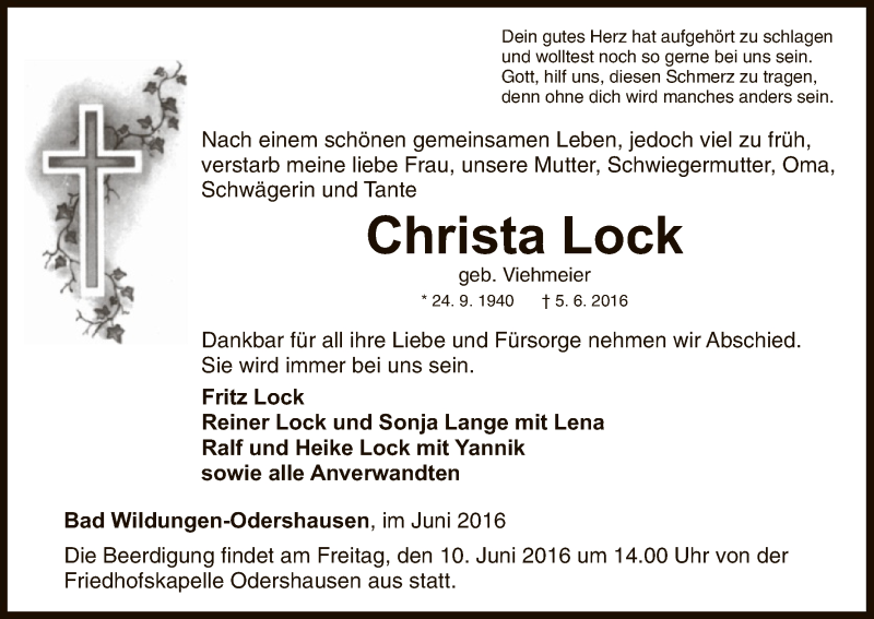 Hier finden Sie alle Traueranzeigen aus der Zeitung, die bisher für Christa Lock erschienen sind. Weitere Traueranzeigen, die in der Zeitung erscheinen, werden hier ebenfalls aufgelistet