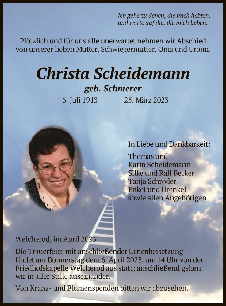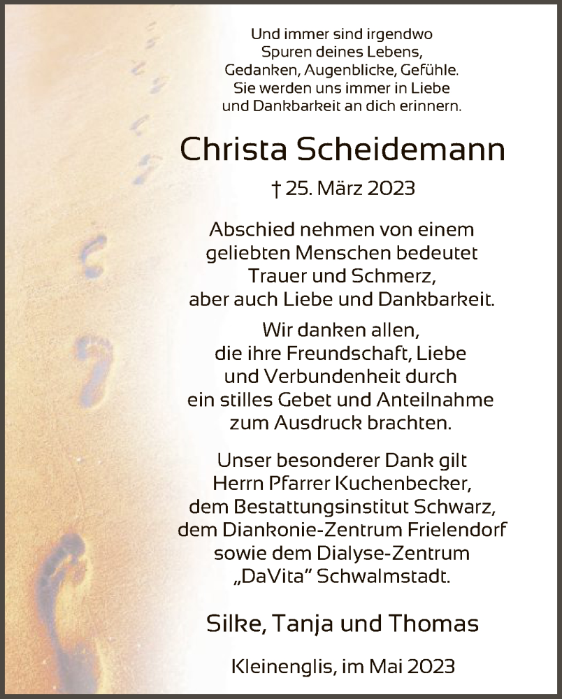 Hier finden Sie alle Traueranzeigen aus der Zeitung, die bisher für Christa Scheidemann erschienen sind. Weitere Traueranzeigen, die in der Zeitung erscheinen, werden hier ebenfalls aufgelistet