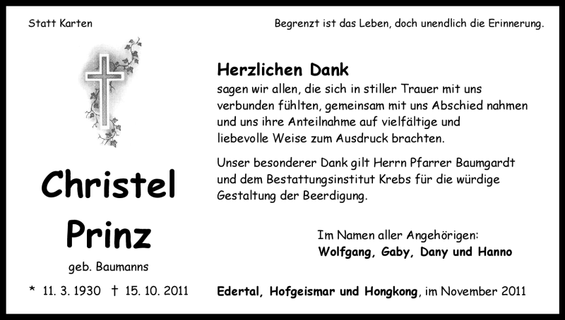 Hier finden Sie alle Traueranzeigen aus der Zeitung, die bisher für Christel Prinz erschienen sind. Weitere Traueranzeigen, die in der Zeitung erscheinen, werden hier ebenfalls aufgelistet