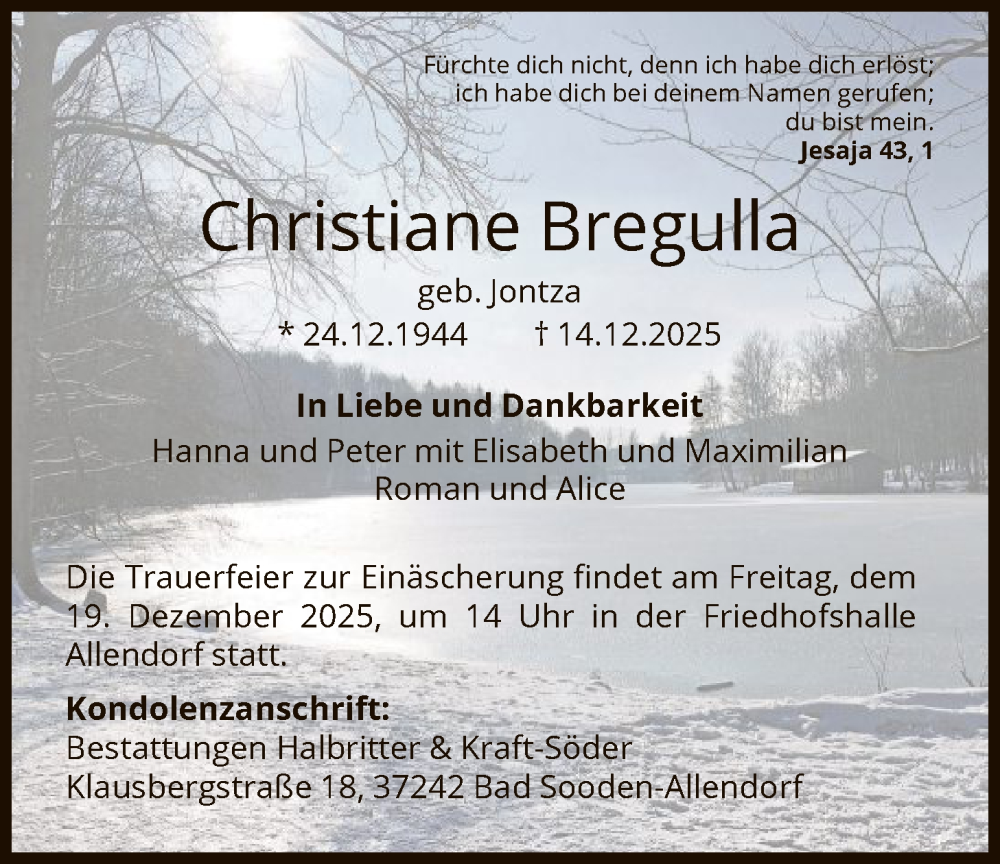 Hier finden Sie alle Traueranzeigen aus der Zeitung, die bisher für Christiane Bregulla erschienen sind. Weitere Traueranzeigen, die in der Zeitung erscheinen, werden hier ebenfalls aufgelistet