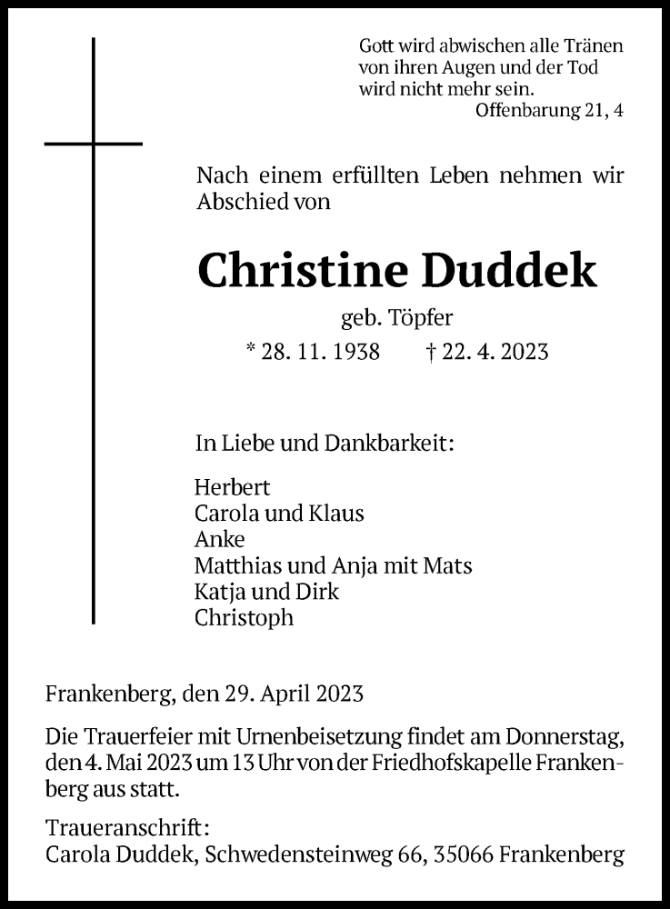 Hier finden Sie alle Traueranzeigen aus der Zeitung, die bisher für Christine Duddek erschienen sind. Weitere Traueranzeigen, die in der Zeitung erscheinen, werden hier ebenfalls aufgelistet