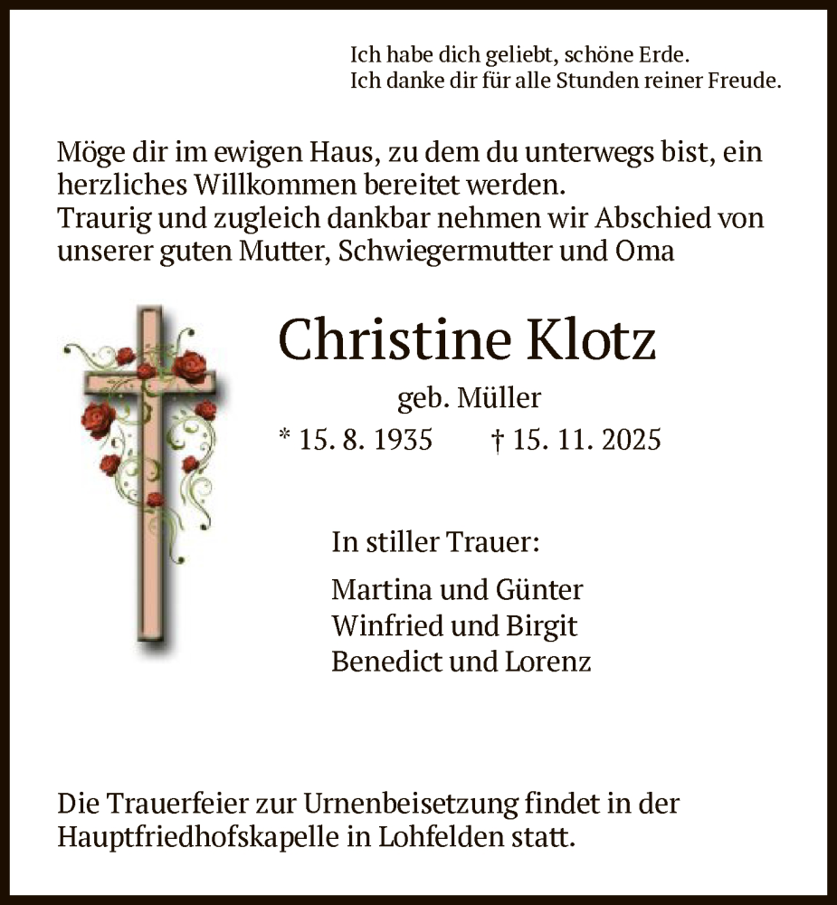 Hier finden Sie alle Traueranzeigen aus der Zeitung, die bisher für Christine Klotz erschienen sind. Weitere Traueranzeigen, die in der Zeitung erscheinen, werden hier ebenfalls aufgelistet