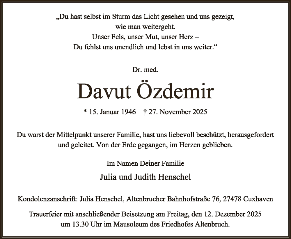 Hier finden Sie alle Traueranzeigen aus der Zeitung, die bisher für Davut Özdemir erschienen sind. Weitere Traueranzeigen, die in der Zeitung erscheinen, werden hier ebenfalls aufgelistet