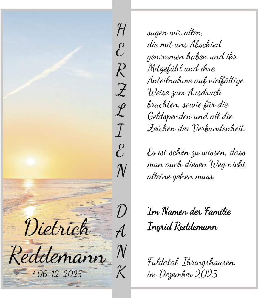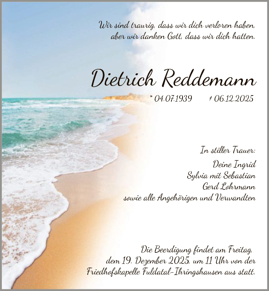 Hier finden Sie alle Traueranzeigen aus der Zeitung, die bisher für Dietrich Reddemann erschienen sind. Weitere Traueranzeigen, die in der Zeitung erscheinen, werden hier ebenfalls aufgelistet
