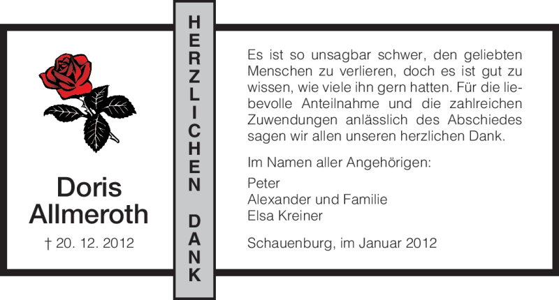 Hier finden Sie alle Traueranzeigen aus der Zeitung, die bisher für Doris Allmeroth erschienen sind. Weitere Traueranzeigen, die in der Zeitung erscheinen, werden hier ebenfalls aufgelistet
