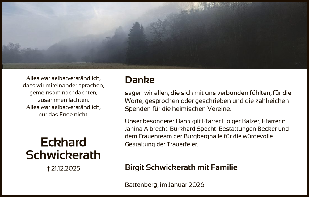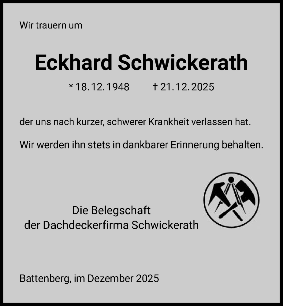 Hier finden Sie alle Traueranzeigen aus der Zeitung, die bisher für Eckhard Schwickerath erschienen sind. Weitere Traueranzeigen, die in der Zeitung erscheinen, werden hier ebenfalls aufgelistet