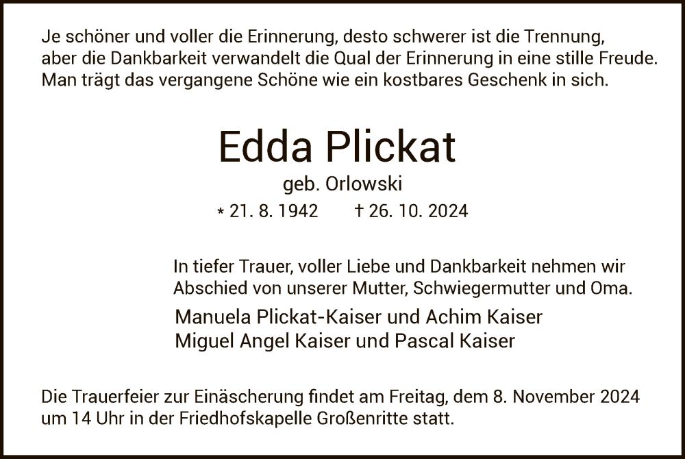 Hier finden Sie alle Traueranzeigen aus der Zeitung, die bisher für Edda Plickat erschienen sind. Weitere Traueranzeigen, die in der Zeitung erscheinen, werden hier ebenfalls aufgelistet