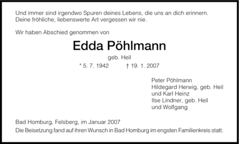 Hier finden Sie alle Traueranzeigen aus der Zeitung, die bisher für Edda Poehlmann erschienen sind. Weitere Traueranzeigen, die in der Zeitung erscheinen, werden hier ebenfalls aufgelistet