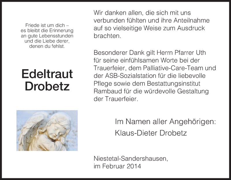 Hier finden Sie alle Traueranzeigen aus der Zeitung, die bisher für Edeltraut Drobetz erschienen sind. Weitere Traueranzeigen, die in der Zeitung erscheinen, werden hier ebenfalls aufgelistet