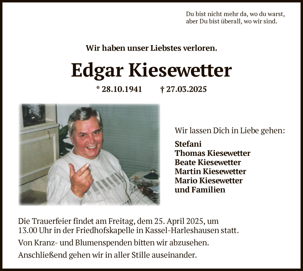 Hier finden Sie alle Traueranzeigen aus der Zeitung, die bisher für Edgar Kiesewetter erschienen sind. Weitere Traueranzeigen, die in der Zeitung erscheinen, werden hier ebenfalls aufgelistet