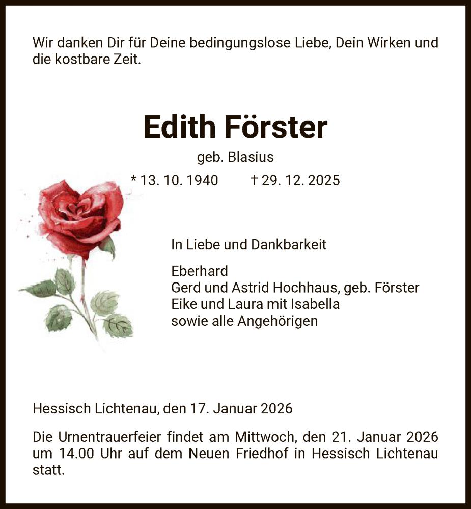 Hier finden Sie alle Traueranzeigen aus der Zeitung, die bisher für Edith Förster erschienen sind. Weitere Traueranzeigen, die in der Zeitung erscheinen, werden hier ebenfalls aufgelistet