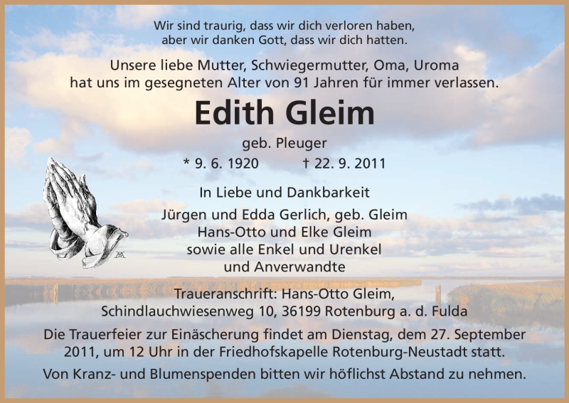 Hier finden Sie alle Traueranzeigen aus der Zeitung, die bisher für Edith Gleim erschienen sind. Weitere Traueranzeigen, die in der Zeitung erscheinen, werden hier ebenfalls aufgelistet
