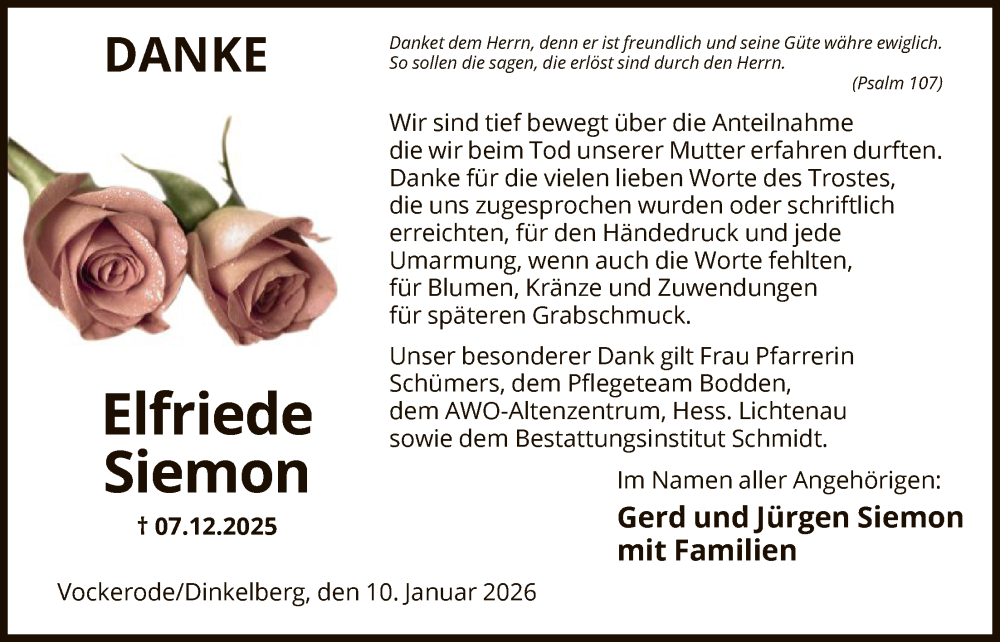 Hier finden Sie alle Traueranzeigen aus der Zeitung, die bisher für Elfriede Siemon erschienen sind. Weitere Traueranzeigen, die in der Zeitung erscheinen, werden hier ebenfalls aufgelistet