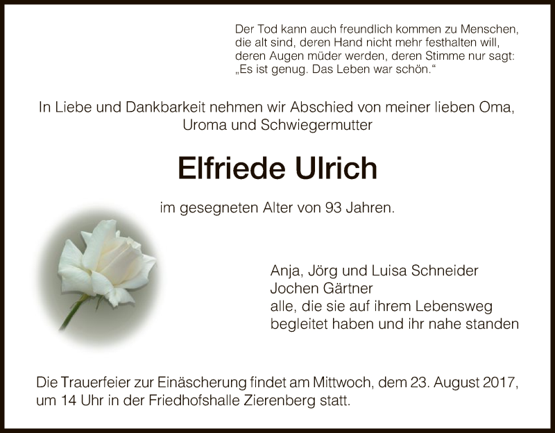 Hier finden Sie alle Traueranzeigen aus der Zeitung, die bisher für Elfriede Ulrich erschienen sind. Weitere Traueranzeigen, die in der Zeitung erscheinen, werden hier ebenfalls aufgelistet