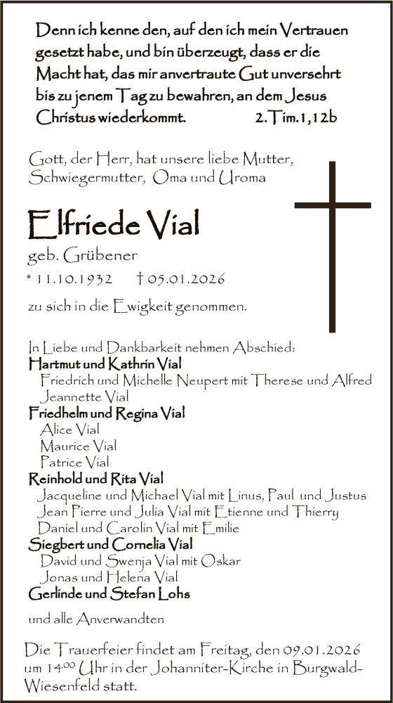Hier finden Sie alle Traueranzeigen aus der Zeitung, die bisher für Elfriede Vial erschienen sind. Weitere Traueranzeigen, die in der Zeitung erscheinen, werden hier ebenfalls aufgelistet