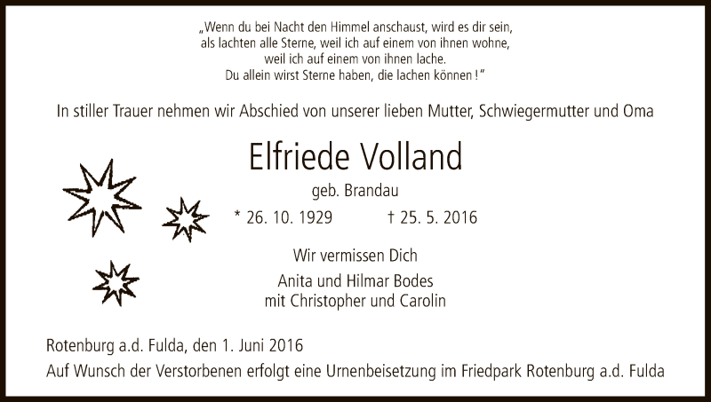 Hier finden Sie alle Traueranzeigen aus der Zeitung, die bisher für Elfriede Volland erschienen sind. Weitere Traueranzeigen, die in der Zeitung erscheinen, werden hier ebenfalls aufgelistet