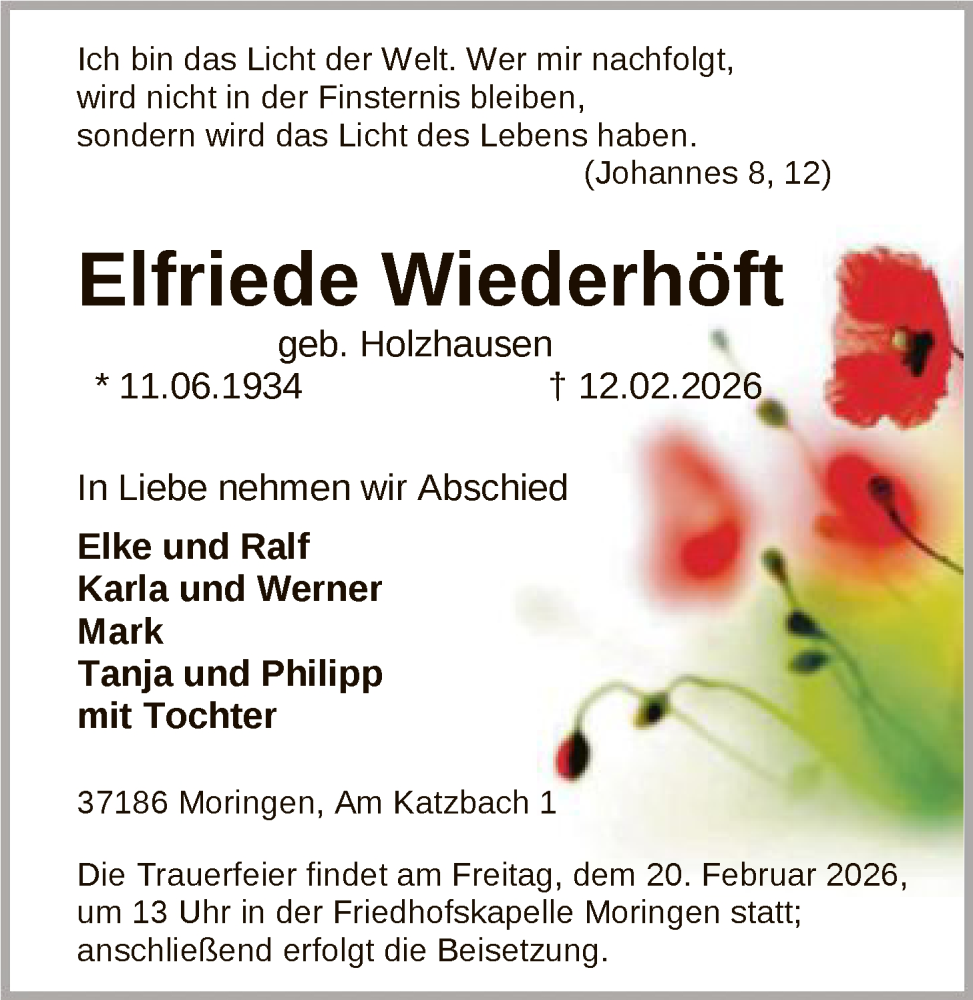 Hier finden Sie alle Traueranzeigen aus der Zeitung, die bisher für Elfriede Wiederhöft erschienen sind. Weitere Traueranzeigen, die in der Zeitung erscheinen, werden hier ebenfalls aufgelistet