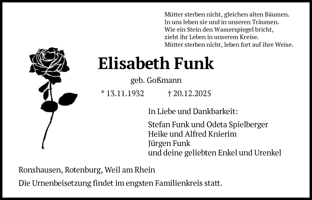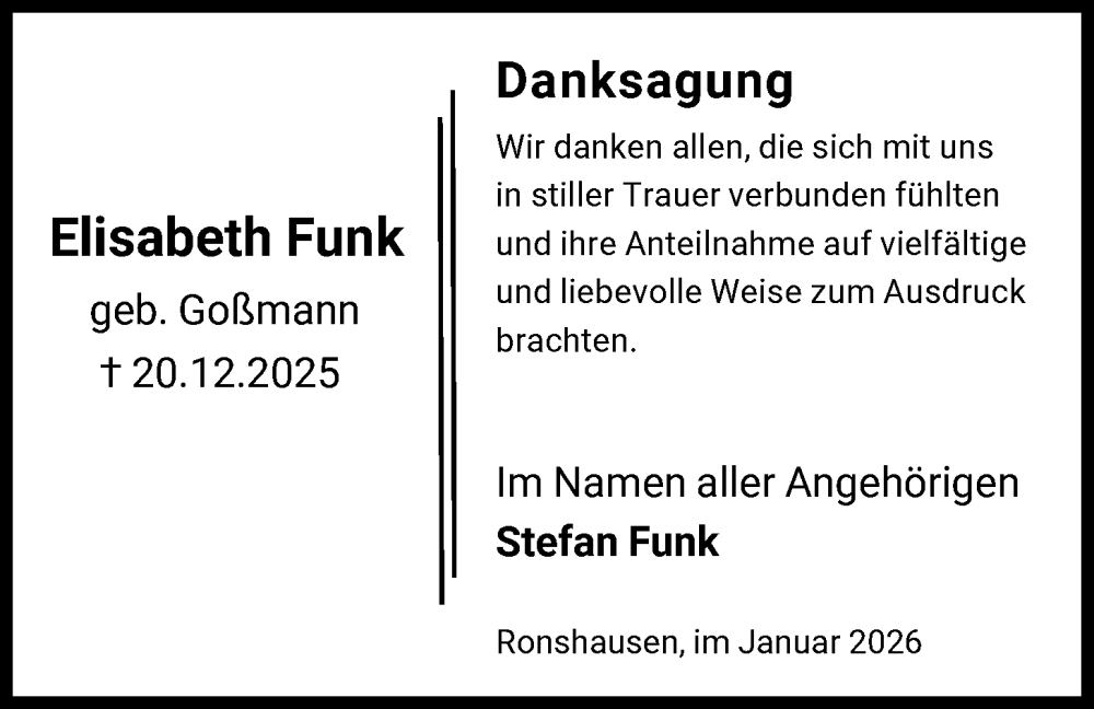 Hier finden Sie alle Traueranzeigen aus der Zeitung, die bisher für Elisabeth Funk erschienen sind. Weitere Traueranzeigen, die in der Zeitung erscheinen, werden hier ebenfalls aufgelistet