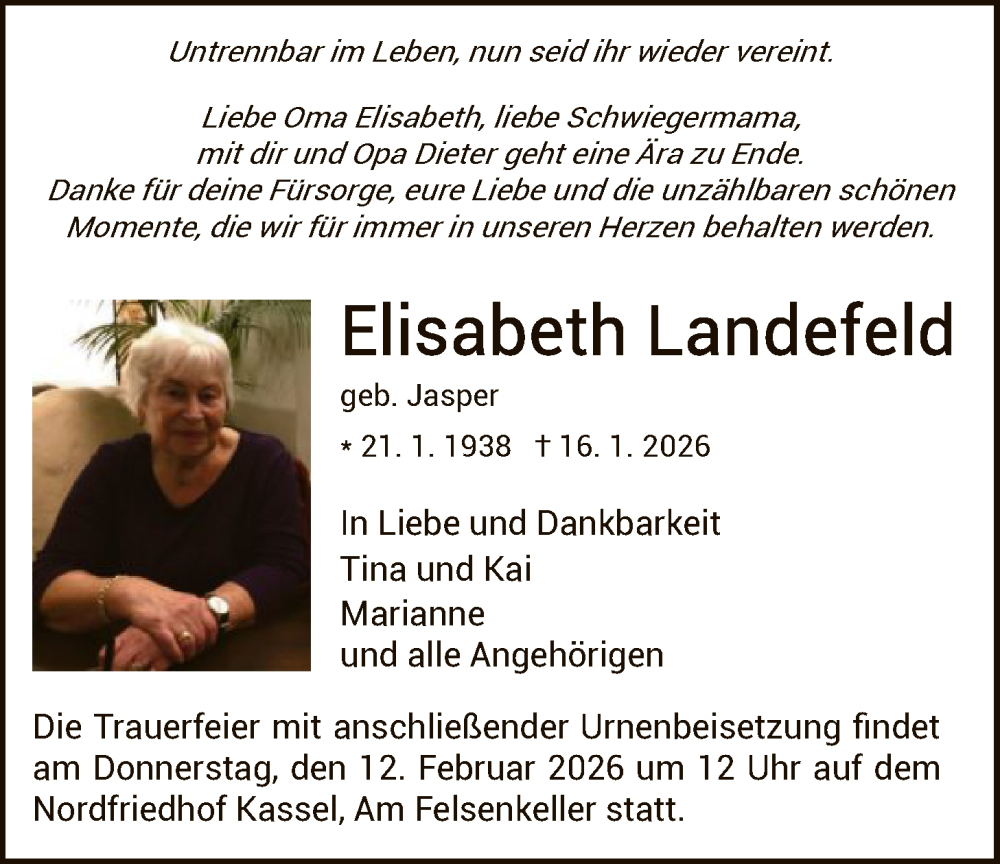 Hier finden Sie alle Traueranzeigen aus der Zeitung, die bisher für Elisabeth Landefeld erschienen sind. Weitere Traueranzeigen, die in der Zeitung erscheinen, werden hier ebenfalls aufgelistet