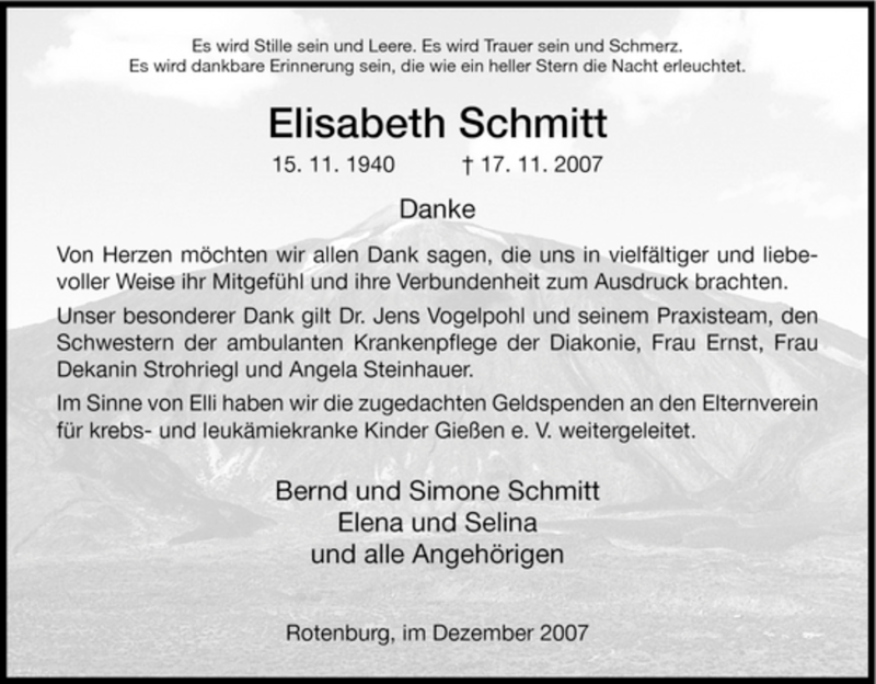 Hier finden Sie alle Traueranzeigen aus der Zeitung, die bisher für Elisabeth Schmitt erschienen sind. Weitere Traueranzeigen, die in der Zeitung erscheinen, werden hier ebenfalls aufgelistet