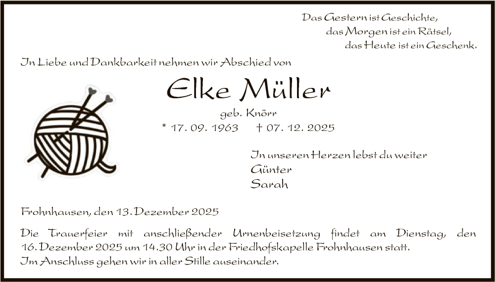 Hier finden Sie alle Traueranzeigen aus der Zeitung, die bisher für Elke Müller erschienen sind. Weitere Traueranzeigen, die in der Zeitung erscheinen, werden hier ebenfalls aufgelistet