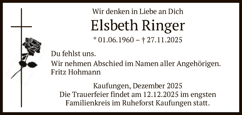 Hier finden Sie alle Traueranzeigen aus der Zeitung, die bisher für Elsbeth Ringer erschienen sind. Weitere Traueranzeigen, die in der Zeitung erscheinen, werden hier ebenfalls aufgelistet