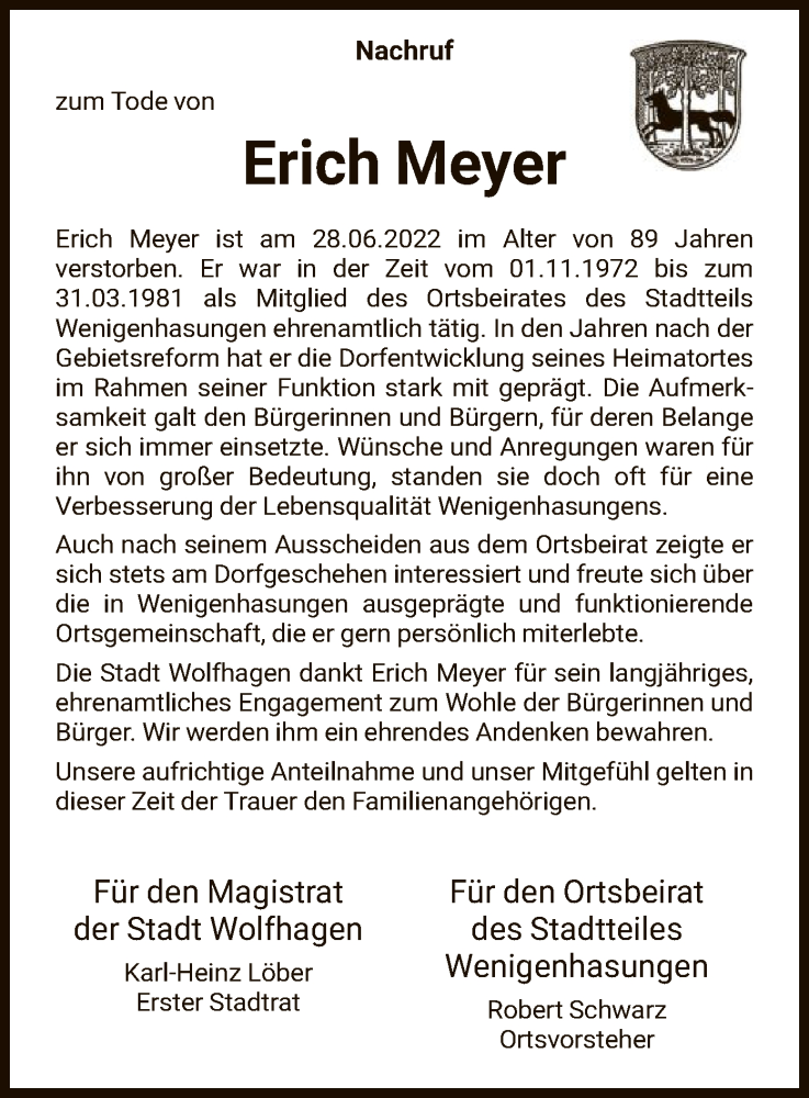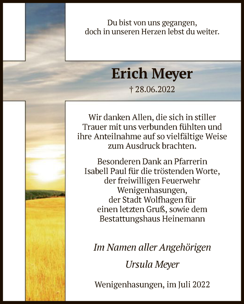 Hier finden Sie alle Traueranzeigen aus der Zeitung, die bisher für Erich Meyer erschienen sind. Weitere Traueranzeigen, die in der Zeitung erscheinen, werden hier ebenfalls aufgelistet