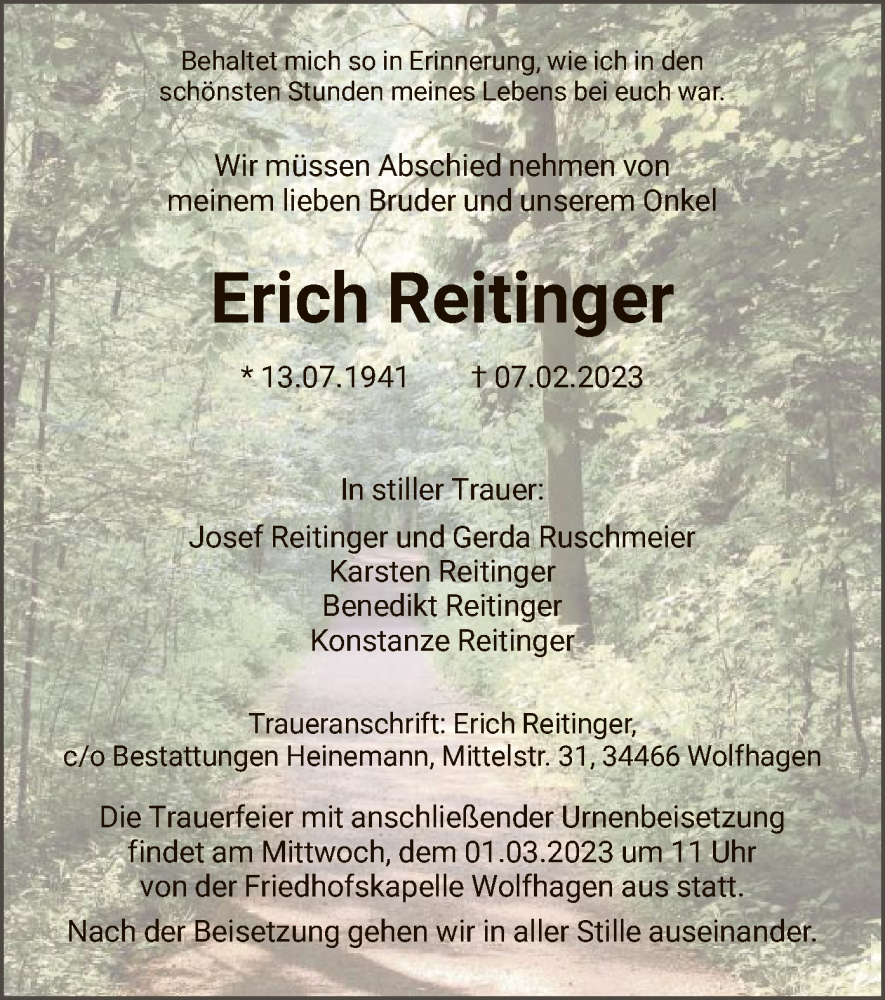 Hier finden Sie alle Traueranzeigen aus der Zeitung, die bisher für Erich Reitinger erschienen sind. Weitere Traueranzeigen, die in der Zeitung erscheinen, werden hier ebenfalls aufgelistet