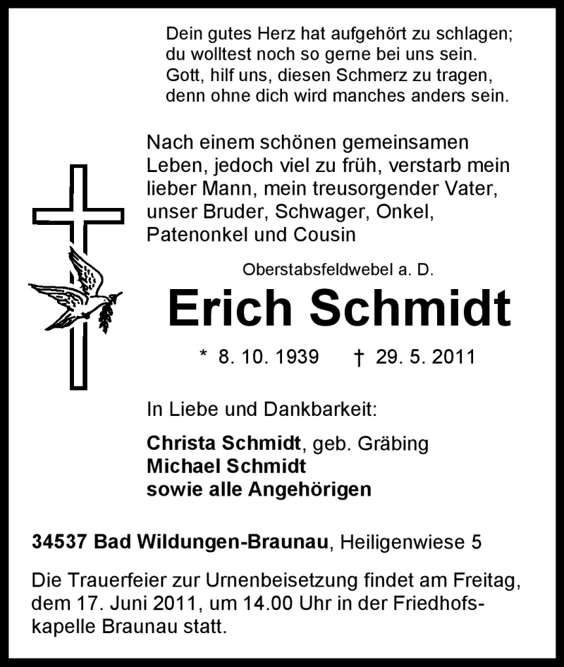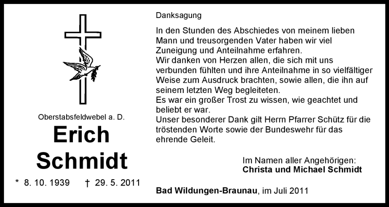 Hier finden Sie alle Traueranzeigen aus der Zeitung, die bisher für Erich Schmidt erschienen sind. Weitere Traueranzeigen, die in der Zeitung erscheinen, werden hier ebenfalls aufgelistet