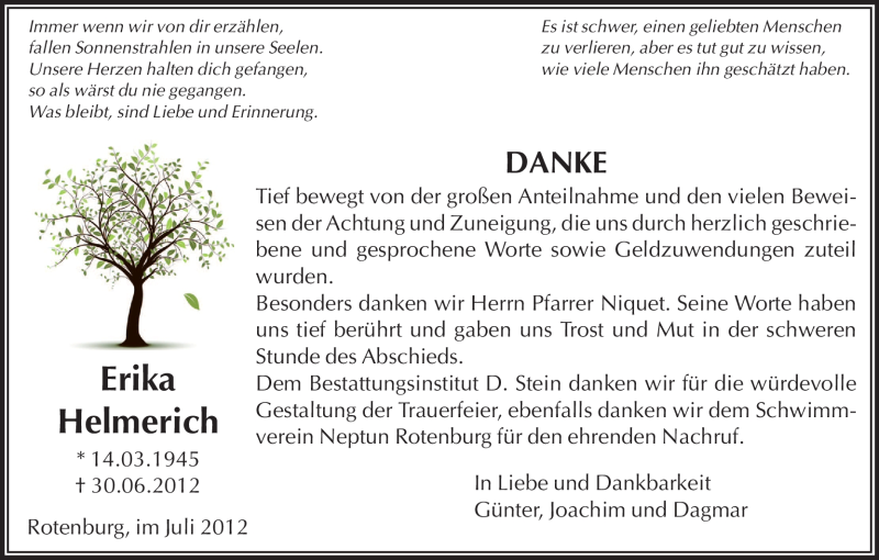 Hier finden Sie alle Traueranzeigen aus der Zeitung, die bisher für Erika Helmerich erschienen sind. Weitere Traueranzeigen, die in der Zeitung erscheinen, werden hier ebenfalls aufgelistet