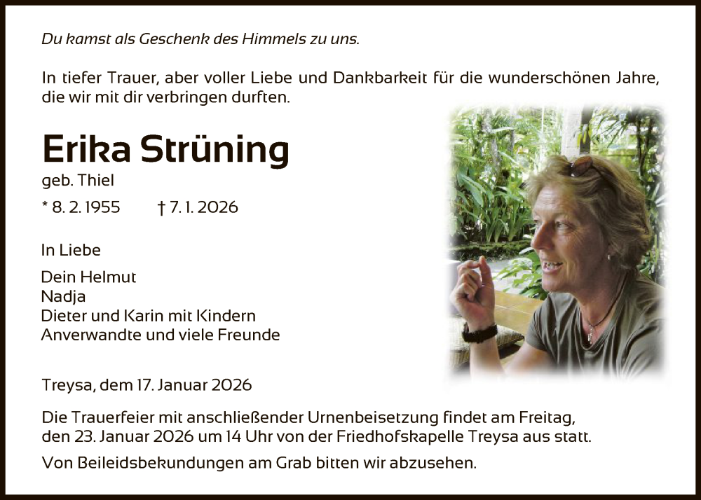 Hier finden Sie alle Traueranzeigen aus der Zeitung, die bisher für Erika Strüning erschienen sind. Weitere Traueranzeigen, die in der Zeitung erscheinen, werden hier ebenfalls aufgelistet