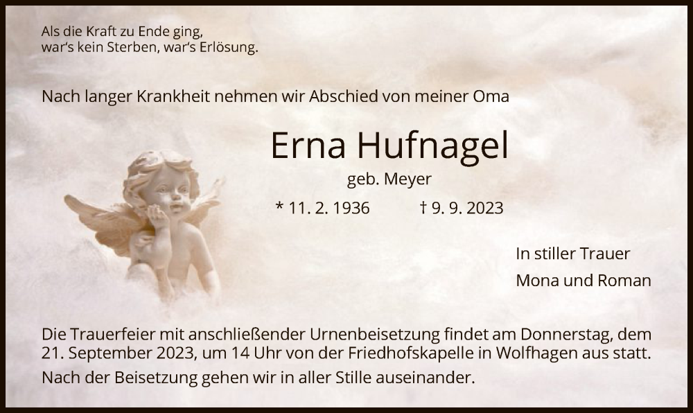 Hier finden Sie alle Traueranzeigen aus der Zeitung, die bisher für Erna Hufnagel erschienen sind. Weitere Traueranzeigen, die in der Zeitung erscheinen, werden hier ebenfalls aufgelistet