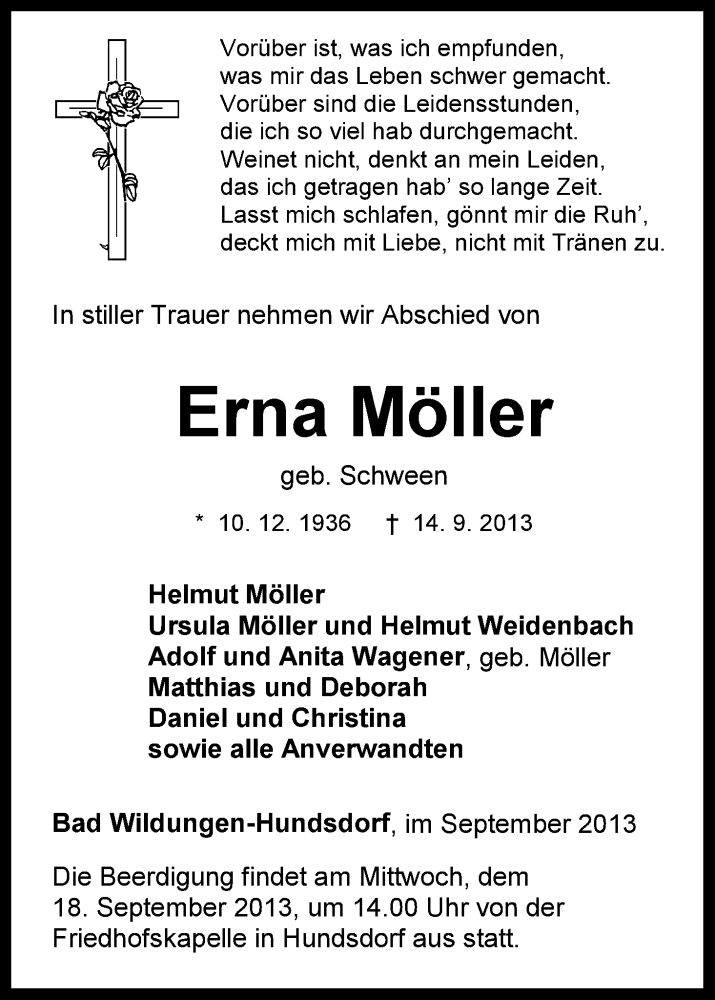 Hier finden Sie alle Traueranzeigen aus der Zeitung, die bisher für Erna Möller erschienen sind. Weitere Traueranzeigen, die in der Zeitung erscheinen, werden hier ebenfalls aufgelistet