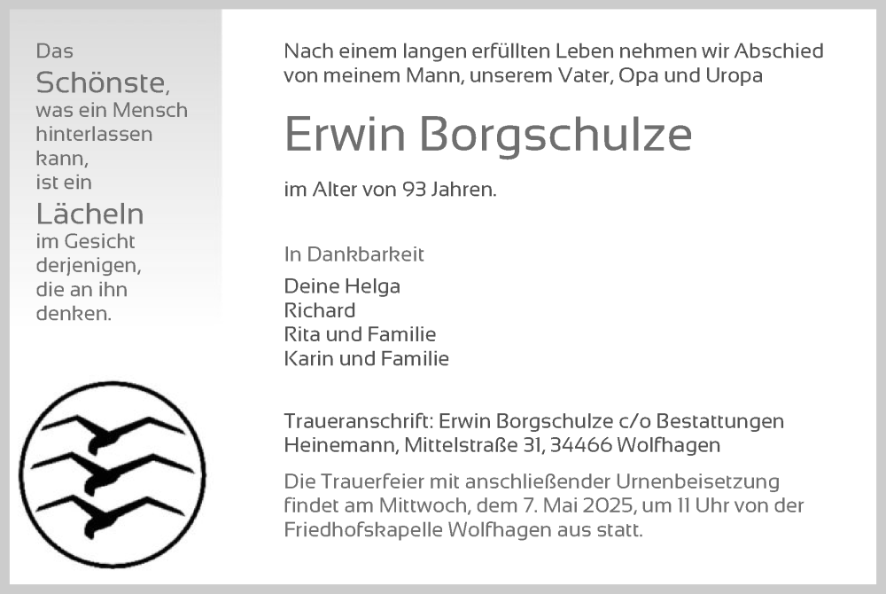 Hier finden Sie alle Traueranzeigen aus der Zeitung, die bisher für Erwin Borgschulze erschienen sind. Weitere Traueranzeigen, die in der Zeitung erscheinen, werden hier ebenfalls aufgelistet
