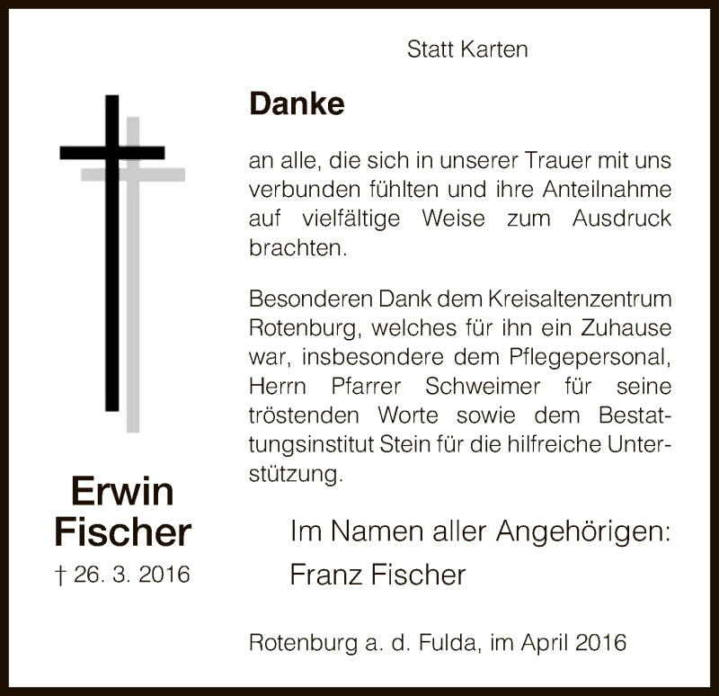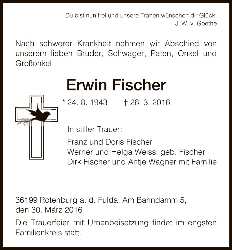 Hier finden Sie alle Traueranzeigen aus der Zeitung, die bisher für Erwin Fischer erschienen sind. Weitere Traueranzeigen, die in der Zeitung erscheinen, werden hier ebenfalls aufgelistet