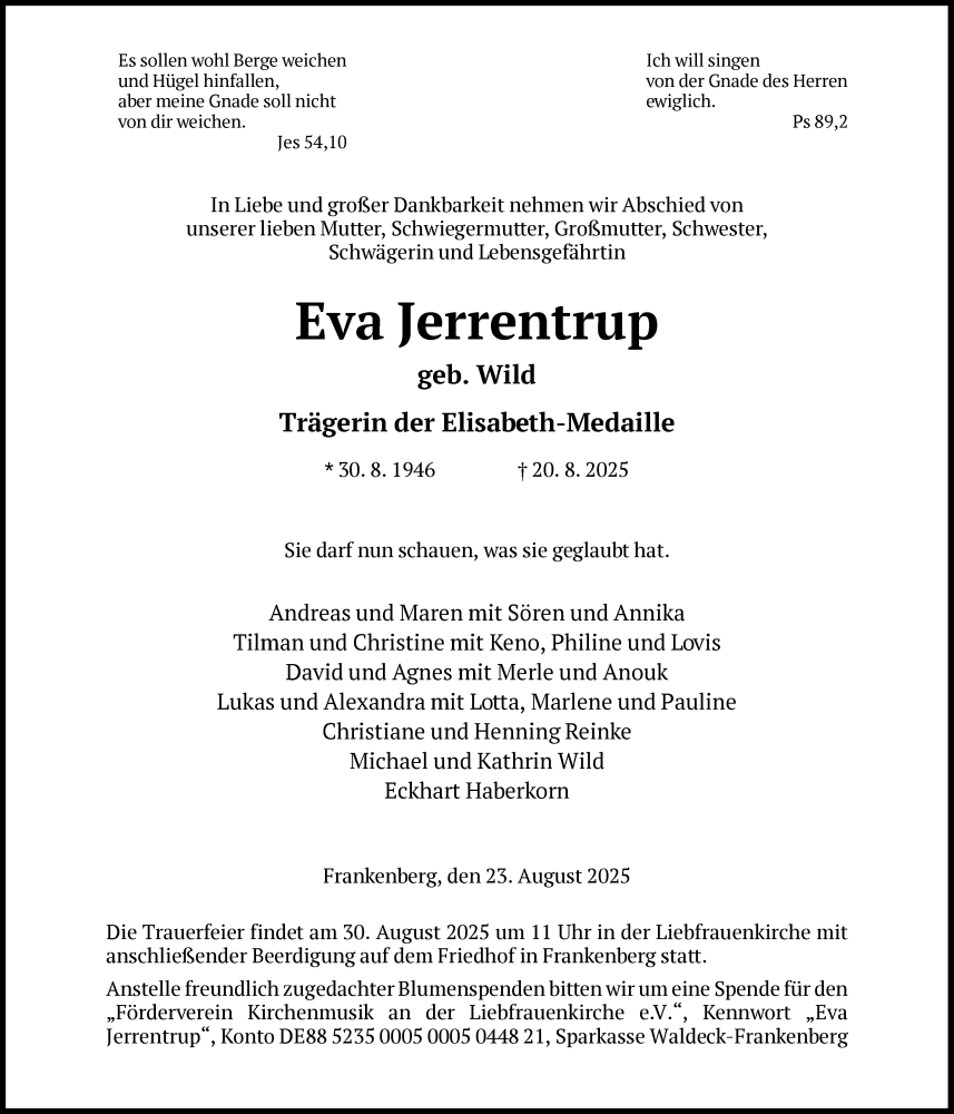 Hier finden Sie alle Traueranzeigen aus der Zeitung, die bisher für Eva Jerrentrup erschienen sind. Weitere Traueranzeigen, die in der Zeitung erscheinen, werden hier ebenfalls aufgelistet