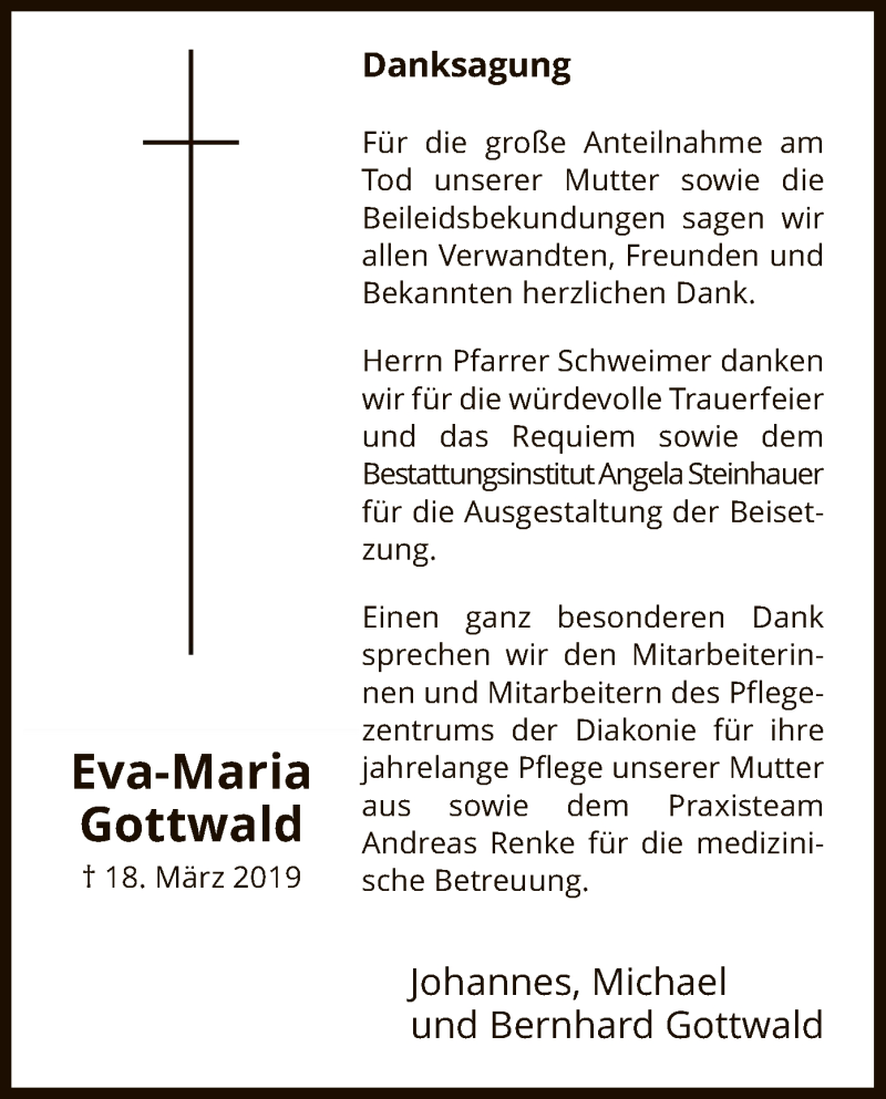 Hier finden Sie alle Traueranzeigen aus der Zeitung, die bisher für Eva-Maria Gottwald erschienen sind. Weitere Traueranzeigen, die in der Zeitung erscheinen, werden hier ebenfalls aufgelistet
