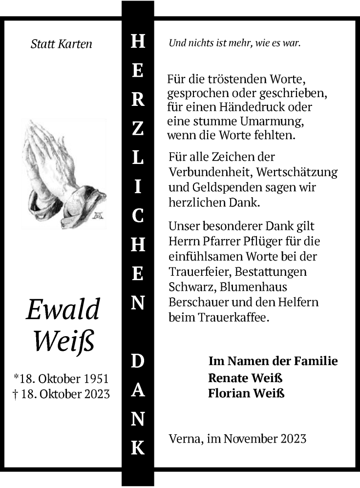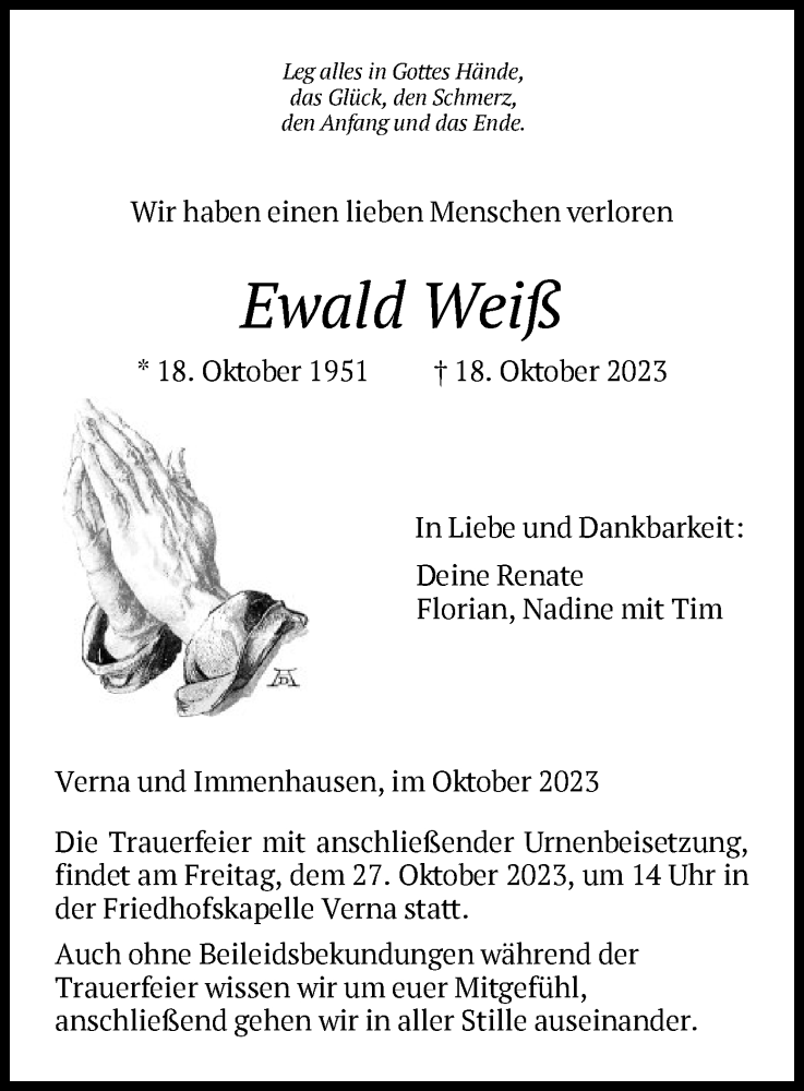 Hier finden Sie alle Traueranzeigen aus der Zeitung, die bisher für Ewald Weiß erschienen sind. Weitere Traueranzeigen, die in der Zeitung erscheinen, werden hier ebenfalls aufgelistet