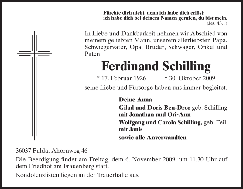 Hier finden Sie alle Traueranzeigen aus der Zeitung, die bisher für Ferdinand Schilling erschienen sind. Weitere Traueranzeigen, die in der Zeitung erscheinen, werden hier ebenfalls aufgelistet