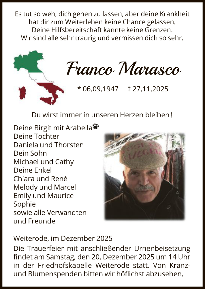 Hier finden Sie alle Traueranzeigen aus der Zeitung, die bisher für Franco Marasco erschienen sind. Weitere Traueranzeigen, die in der Zeitung erscheinen, werden hier ebenfalls aufgelistet