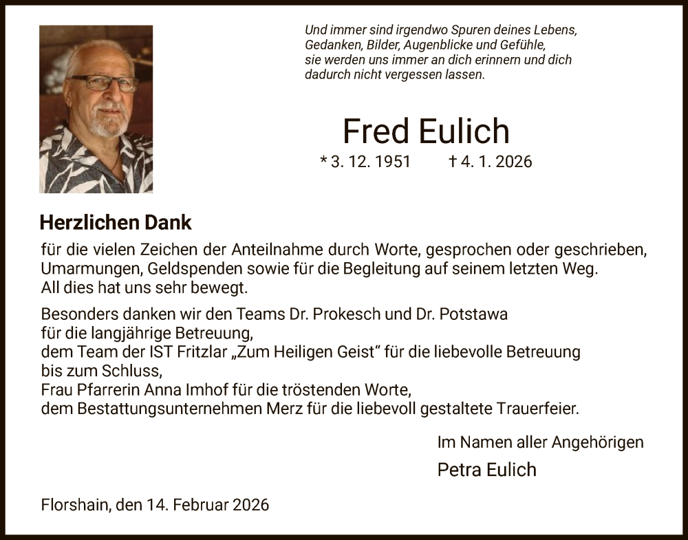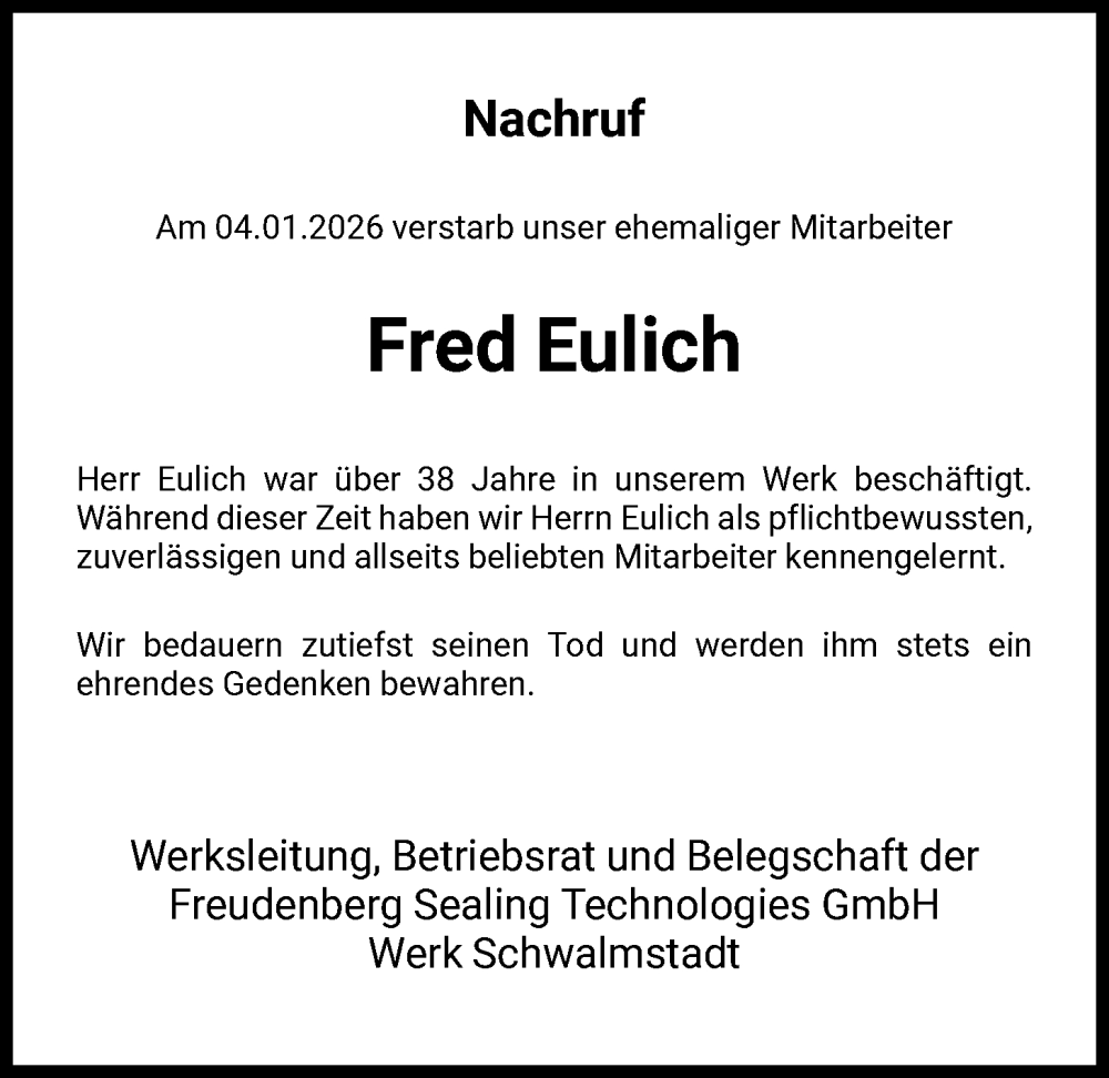Hier finden Sie alle Traueranzeigen aus der Zeitung, die bisher für Fred Eulich erschienen sind. Weitere Traueranzeigen, die in der Zeitung erscheinen, werden hier ebenfalls aufgelistet