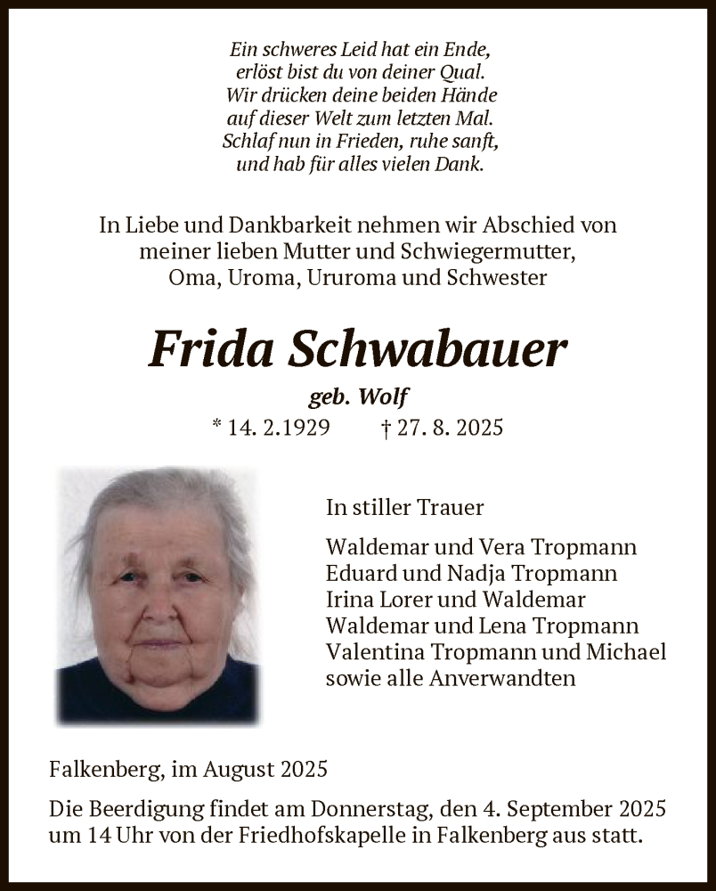 Hier finden Sie alle Traueranzeigen aus der Zeitung, die bisher für Frida Schwabauer erschienen sind. Weitere Traueranzeigen, die in der Zeitung erscheinen, werden hier ebenfalls aufgelistet