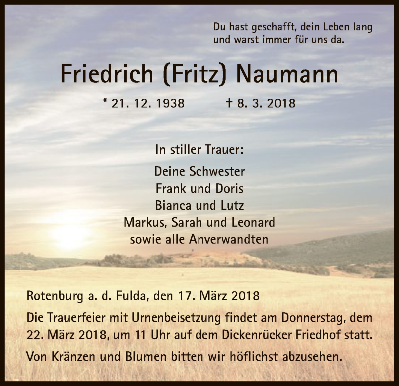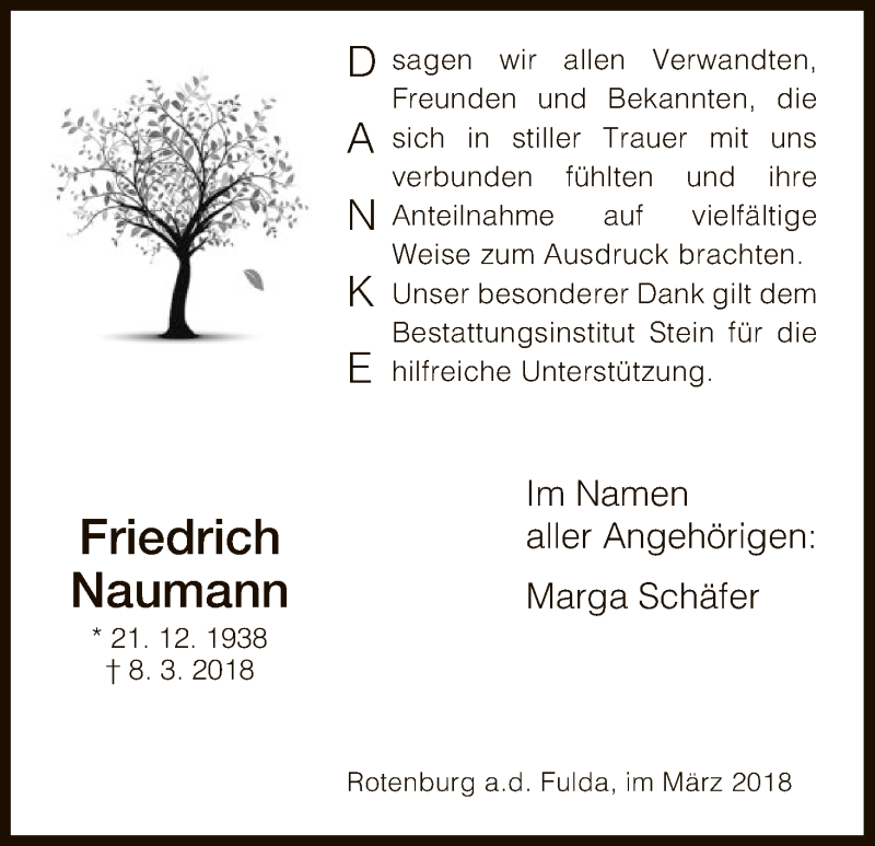 Hier finden Sie alle Traueranzeigen aus der Zeitung, die bisher für Friedrich Naumann erschienen sind. Weitere Traueranzeigen, die in der Zeitung erscheinen, werden hier ebenfalls aufgelistet
