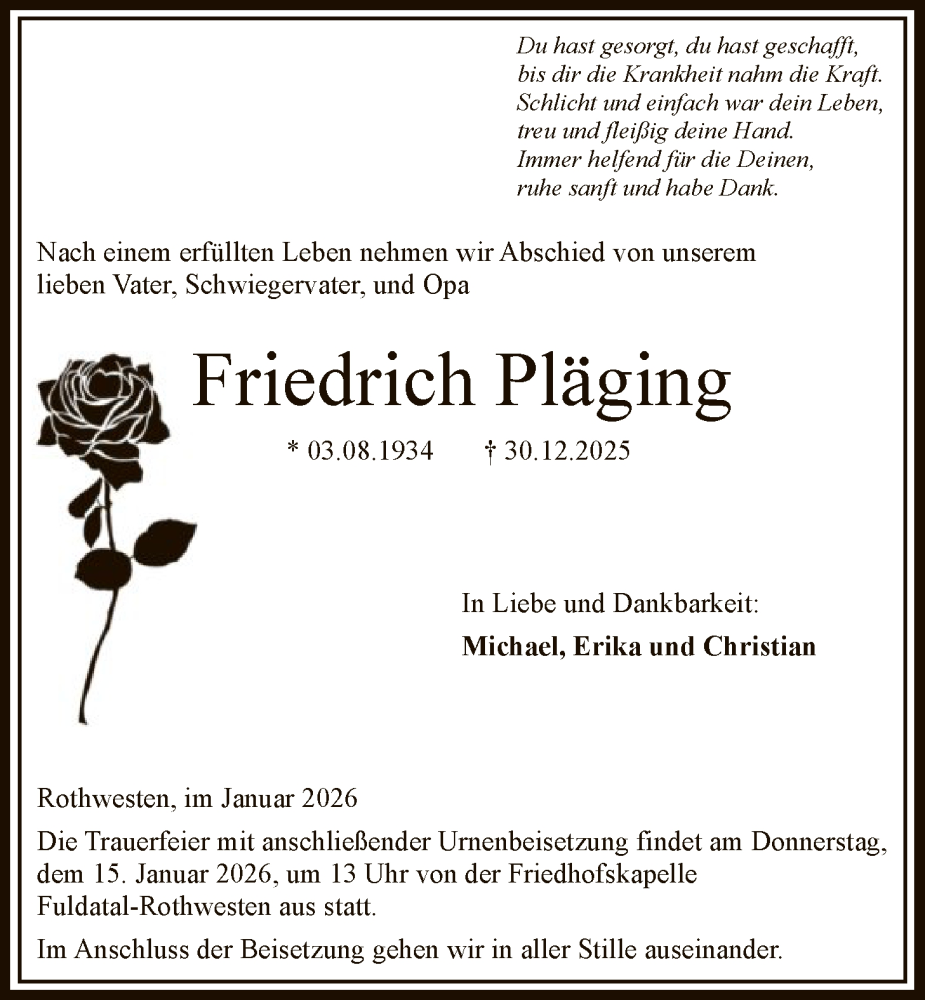 Hier finden Sie alle Traueranzeigen aus der Zeitung, die bisher für Friedrich Pläging erschienen sind. Weitere Traueranzeigen, die in der Zeitung erscheinen, werden hier ebenfalls aufgelistet