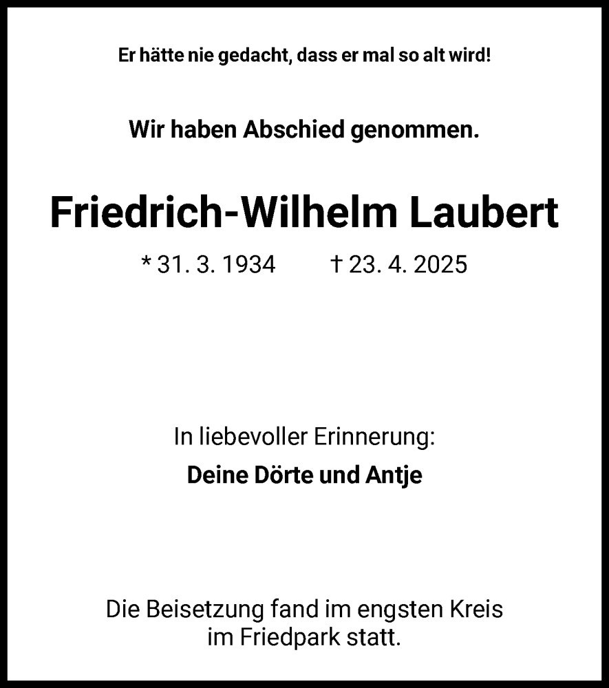 Hier finden Sie alle Traueranzeigen aus der Zeitung, die bisher für Friedrich-Wilhelm Laubert erschienen sind. Weitere Traueranzeigen, die in der Zeitung erscheinen, werden hier ebenfalls aufgelistet