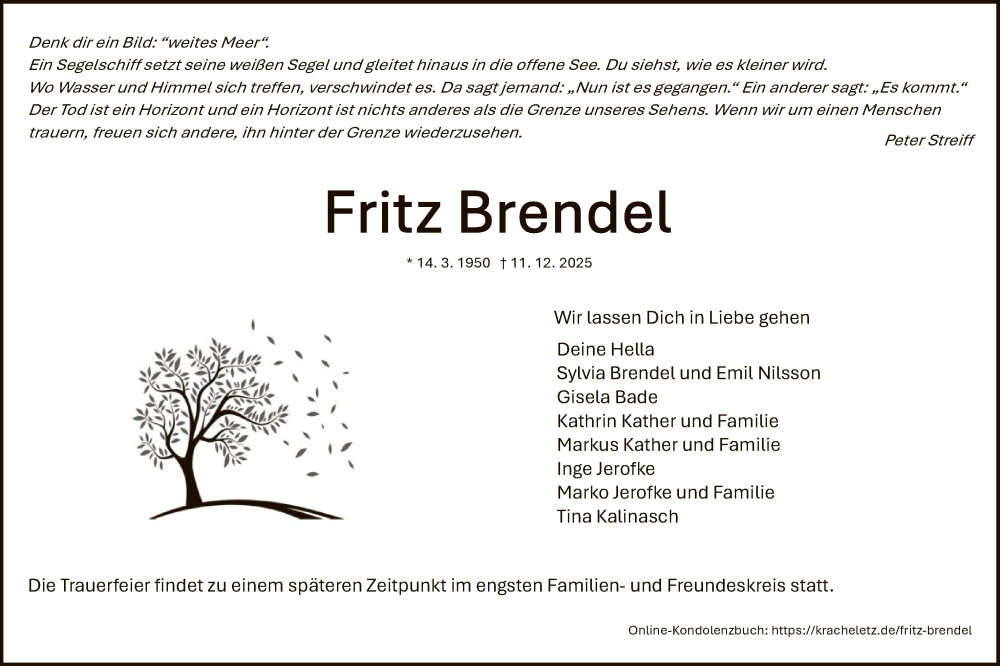Hier finden Sie alle Traueranzeigen aus der Zeitung, die bisher für Fritz Brendel erschienen sind. Weitere Traueranzeigen, die in der Zeitung erscheinen, werden hier ebenfalls aufgelistet