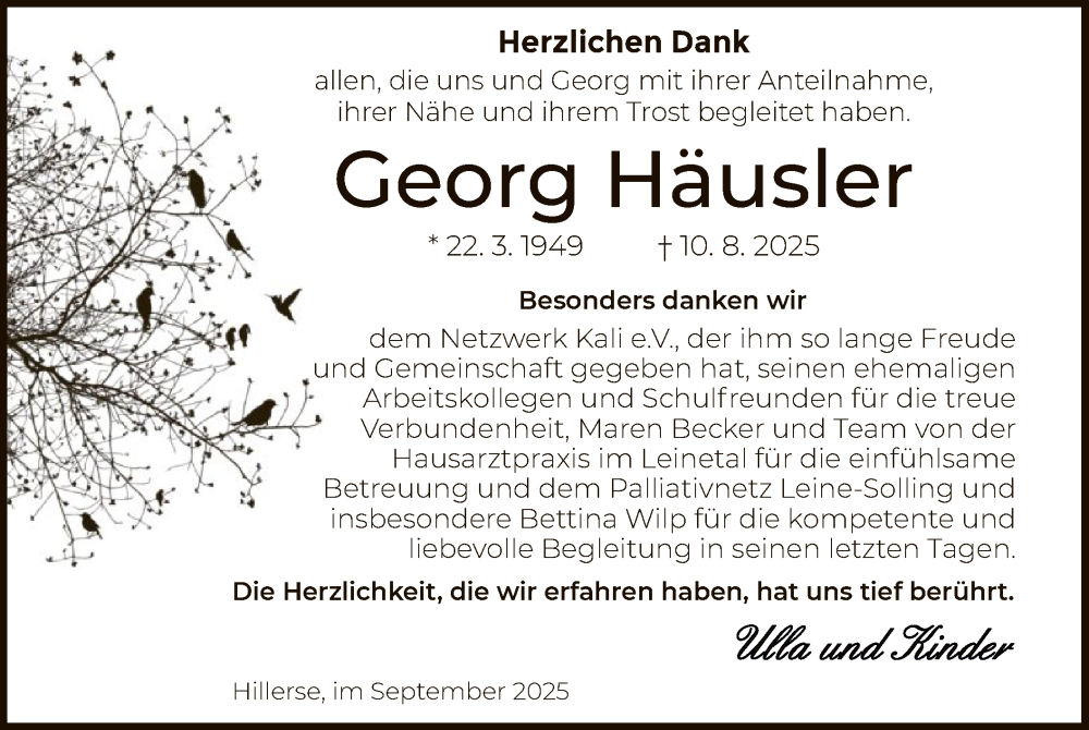 Hier finden Sie alle Traueranzeigen aus der Zeitung, die bisher für Georg Häusler erschienen sind. Weitere Traueranzeigen, die in der Zeitung erscheinen, werden hier ebenfalls aufgelistet
