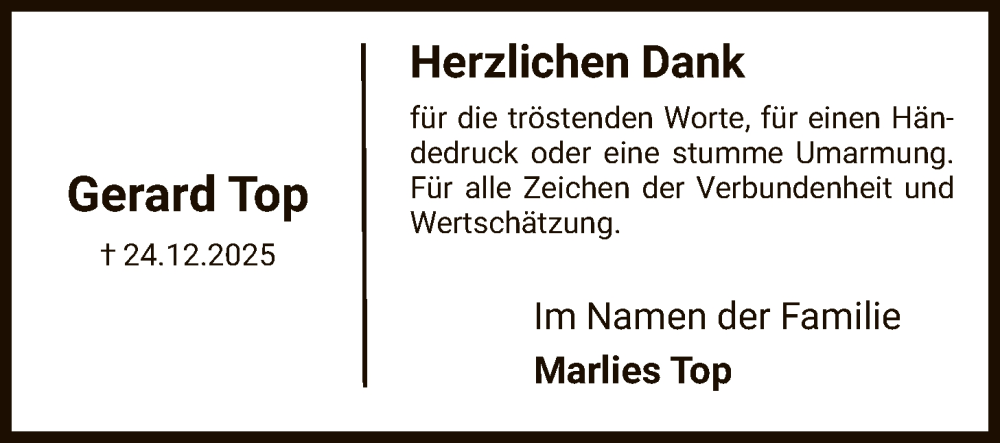 Hier finden Sie alle Traueranzeigen aus der Zeitung, die bisher für Gerard Top erschienen sind. Weitere Traueranzeigen, die in der Zeitung erscheinen, werden hier ebenfalls aufgelistet